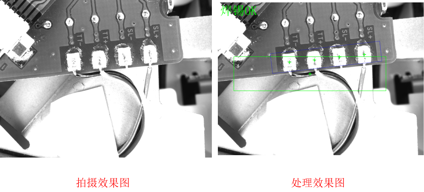 建议使用2个相机拍正反面,相机移动每个检测位置单独拍摄。以目前样品进行实验来看,可以检测不良。焊锡可以检测连焊与缺焊,不过目前样品中焊锡都有氧化现象,实际样品的实际效果不知道是否有差异。