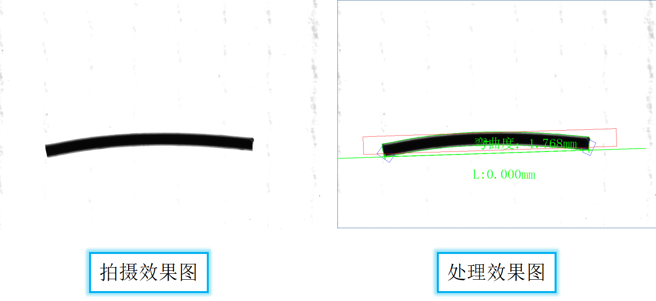 由于目前前向光效果不佳,所以采用背光打光方式,(且无外界环境的光照情况下)根据目前的图像和处理结果来看,可以检测出产品长度并计算出产品弯曲度。